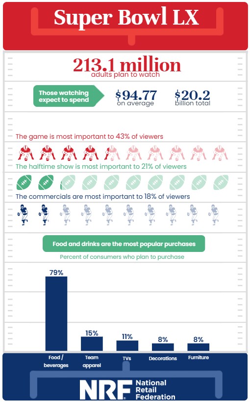 The National Retail Federation has done the hard work of compiling data on spending that will happen related to the Super Bowl. Browse the interactive data on things like total spending, average household spending, and the top category people will be spending their money on. Then check out the infographic that beautifully presents that information in a way that's easy to consume.